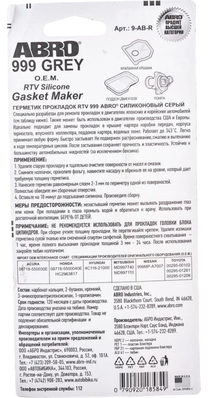 Герметик прокладка ABRO серый фирменный 85г 9AB в Казани