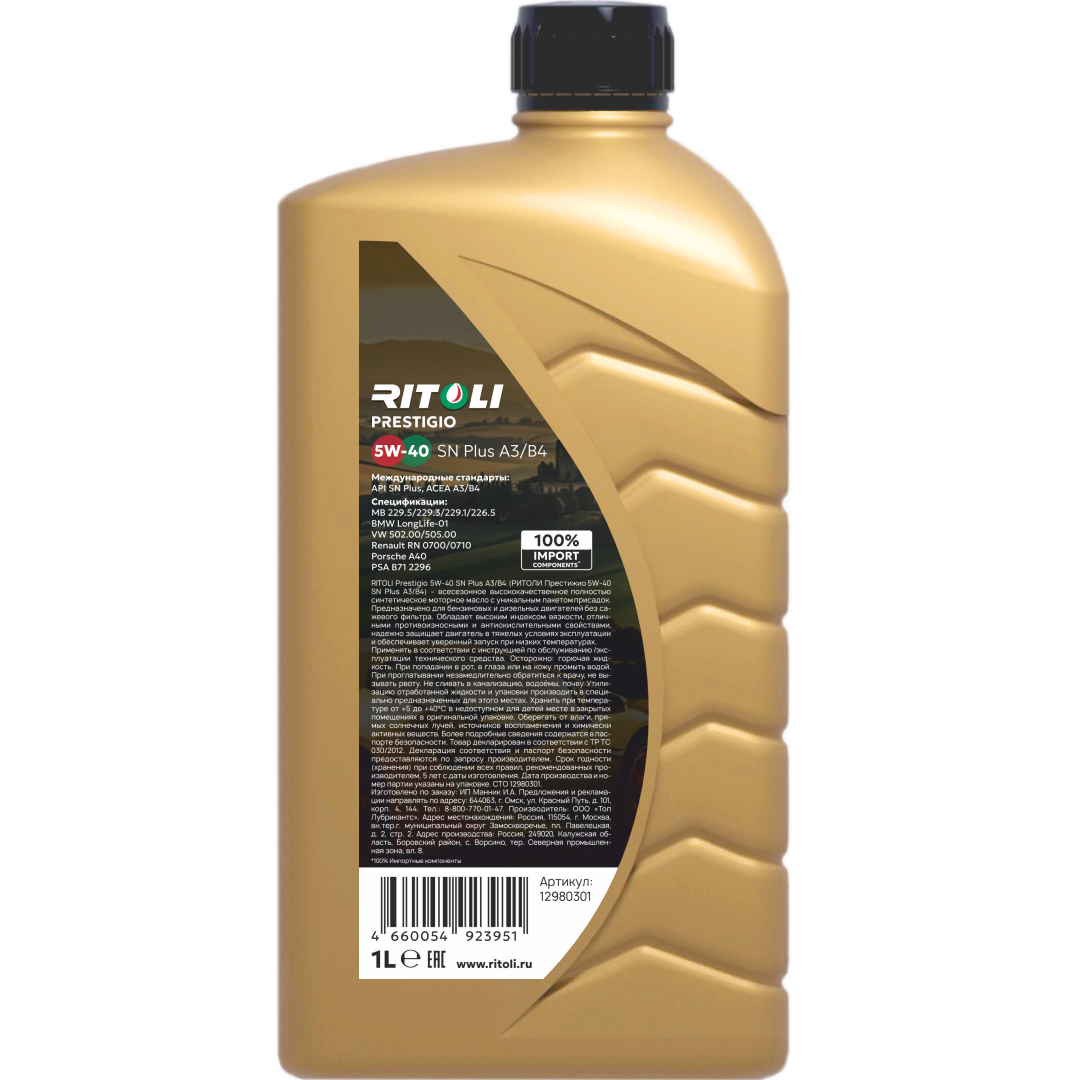 Масло моторное RITOLI Prestigio 5W40 SN Plus A3/B4 1л в Самаре